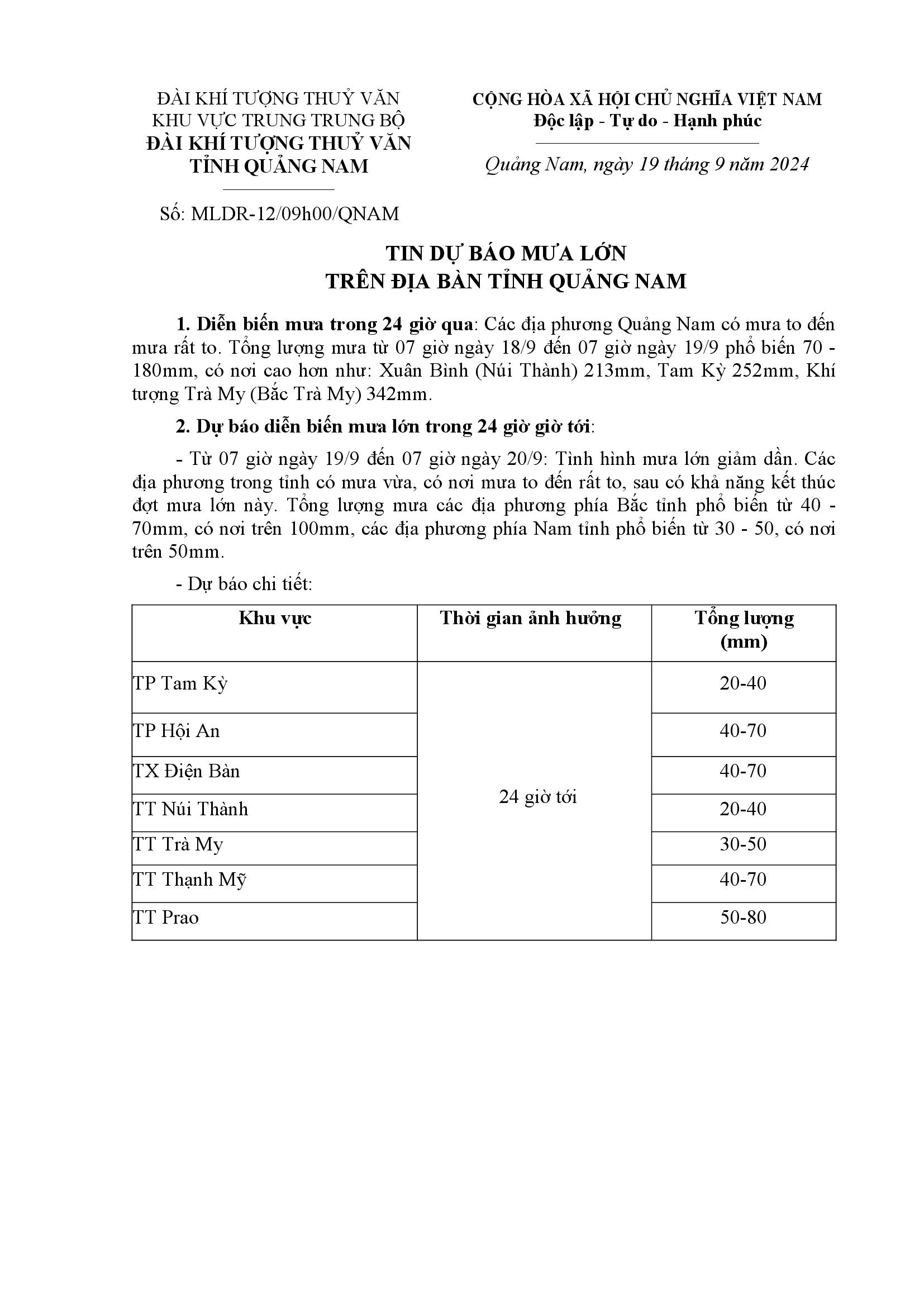 Người đăng: Văn phòng thường trực Ban Chỉ huy Phòng chống thiên tai và TKCN Quảng Nam Ngày đăng: 9:22 | 19/09/2024 Lượt xem: 135