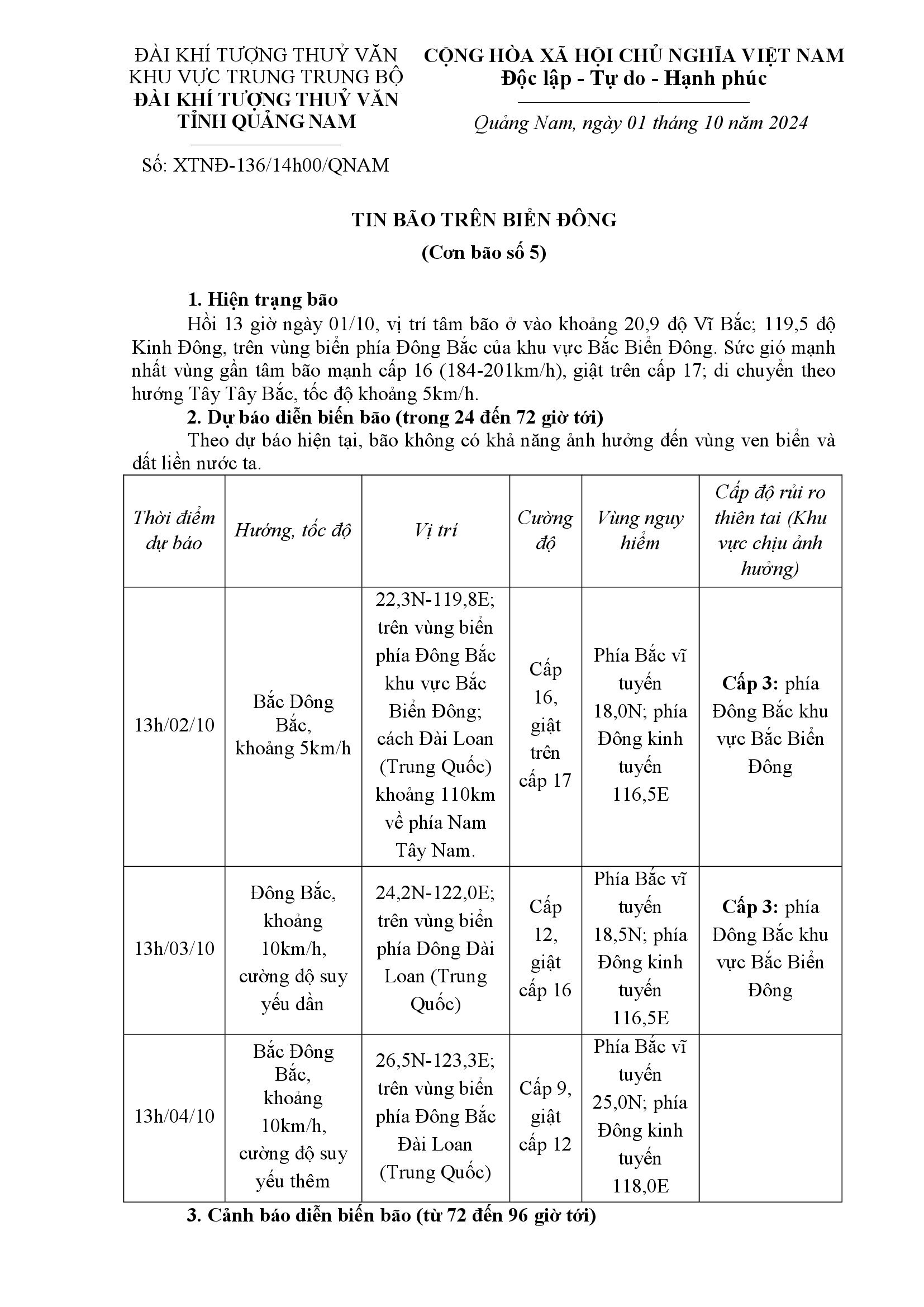 Người đăng: Văn phòng thường trực Ban Chỉ huy Phòng chống thiên tai và TKCN Quảng Nam Ngày đăng: 16:14 | 01/10/2024 Lượt xem: 71