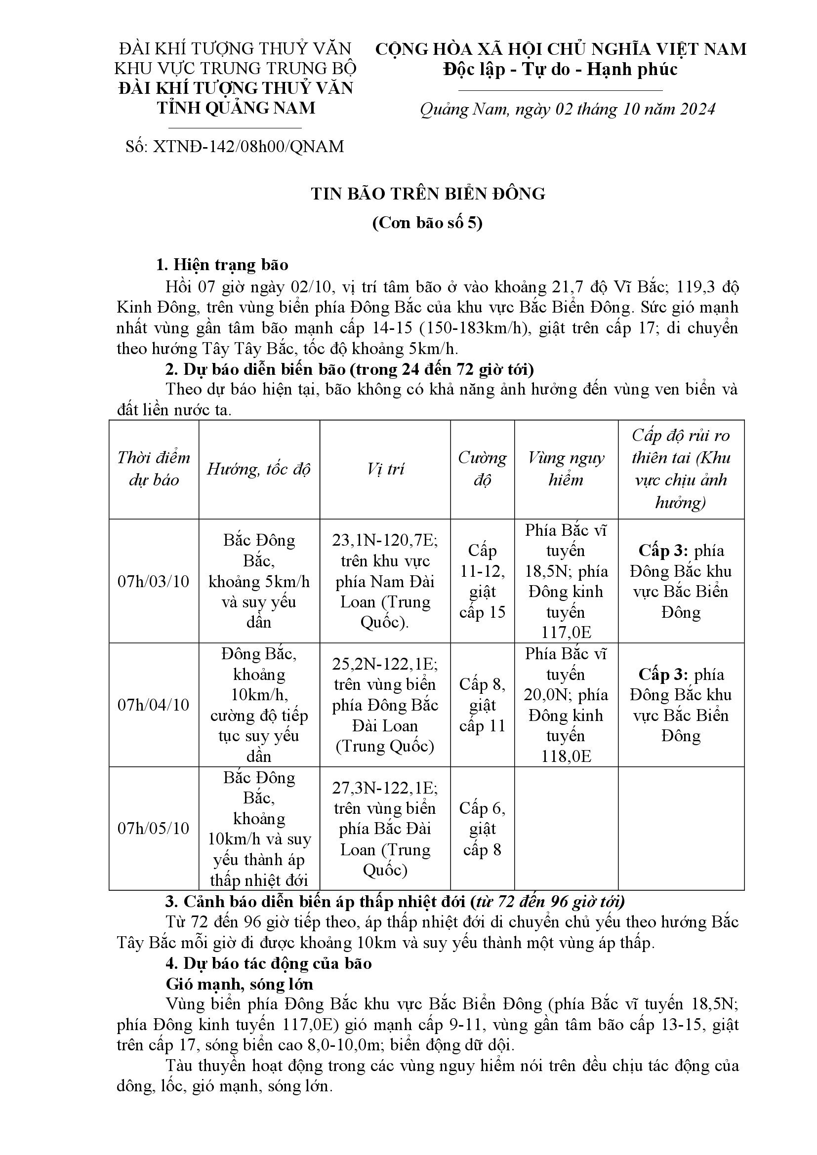 Người đăng: Văn phòng thường trực Ban Chỉ huy Phòng chống thiên tai và TKCN Quảng Nam Ngày đăng: 10:00 | 02/10/2024 Lượt xem: 78