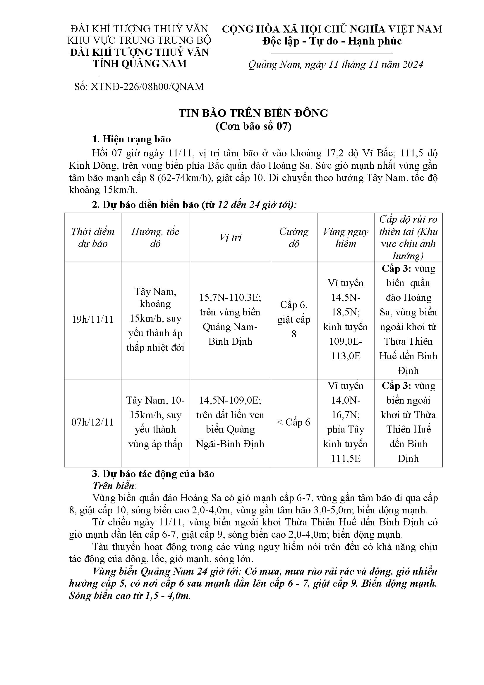 Người đăng: Văn phòng thường trực Ban Chỉ huy Phòng chống thiên tai và TKCN Quảng Nam Ngày đăng: 8:36 | 11/11/2024 Lượt xem: 194
