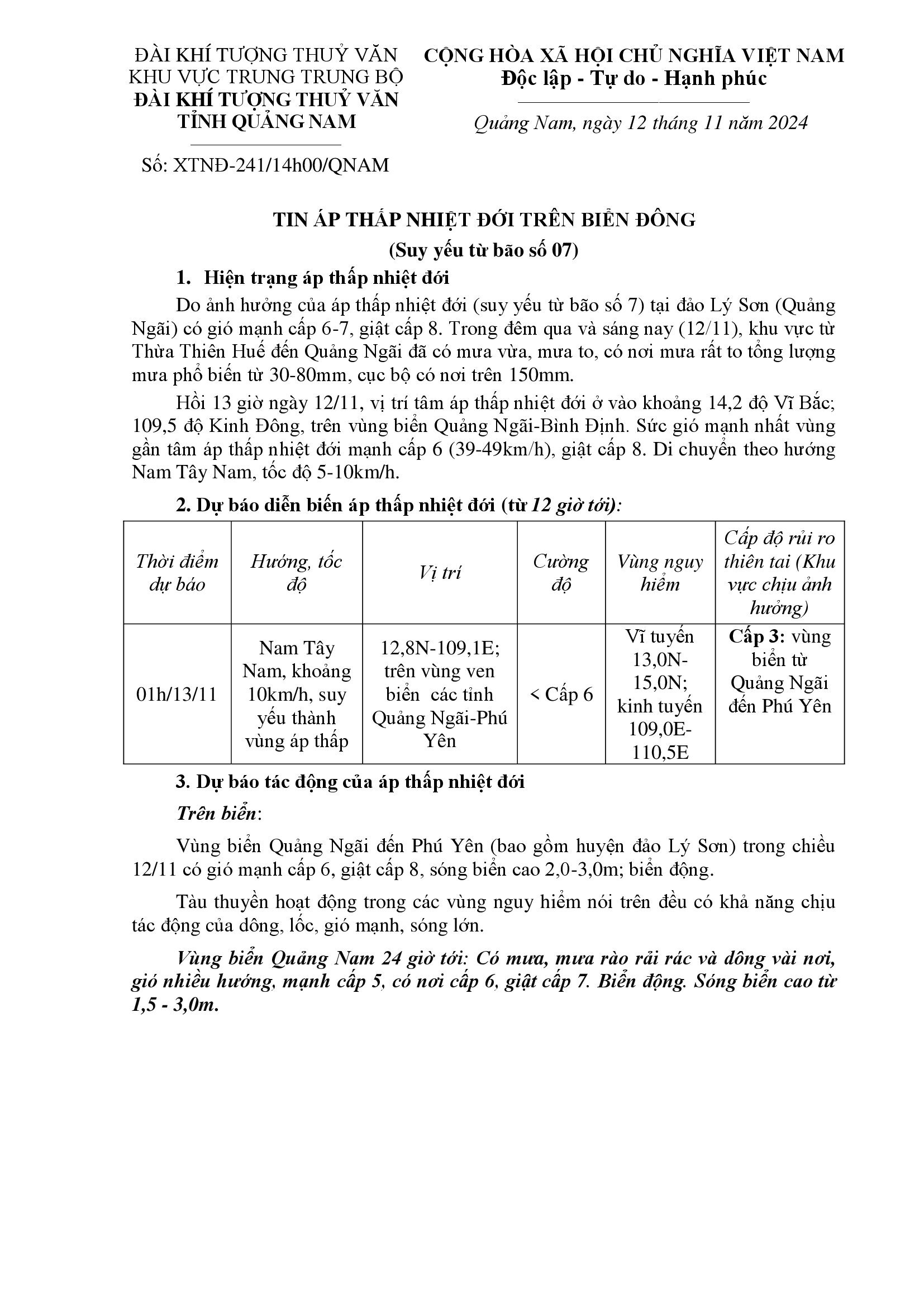 Người đăng: Văn phòng thường trực Ban Chỉ huy Phòng chống thiên tai và TKCN Quảng Nam Ngày đăng: 15:16 | 12/11/2024 Lượt xem: 69