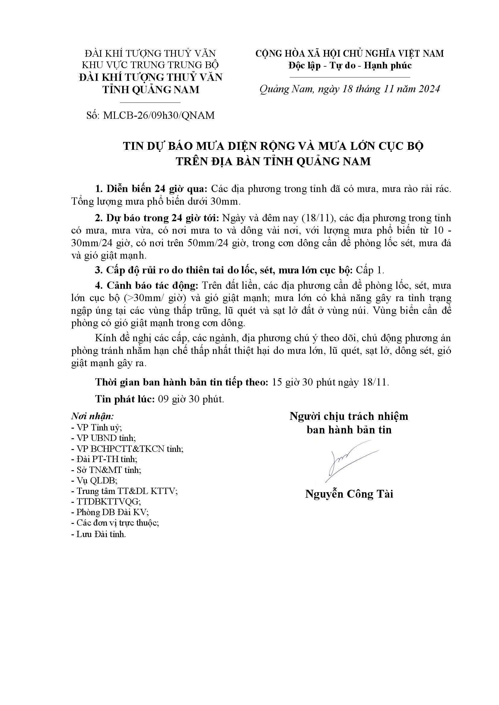 Người đăng: Văn phòng thường trực Ban Chỉ huy Phòng chống thiên tai và TKCN Quảng Nam Ngày đăng: 10:04 | 18/11/2024 Lượt xem: 71
