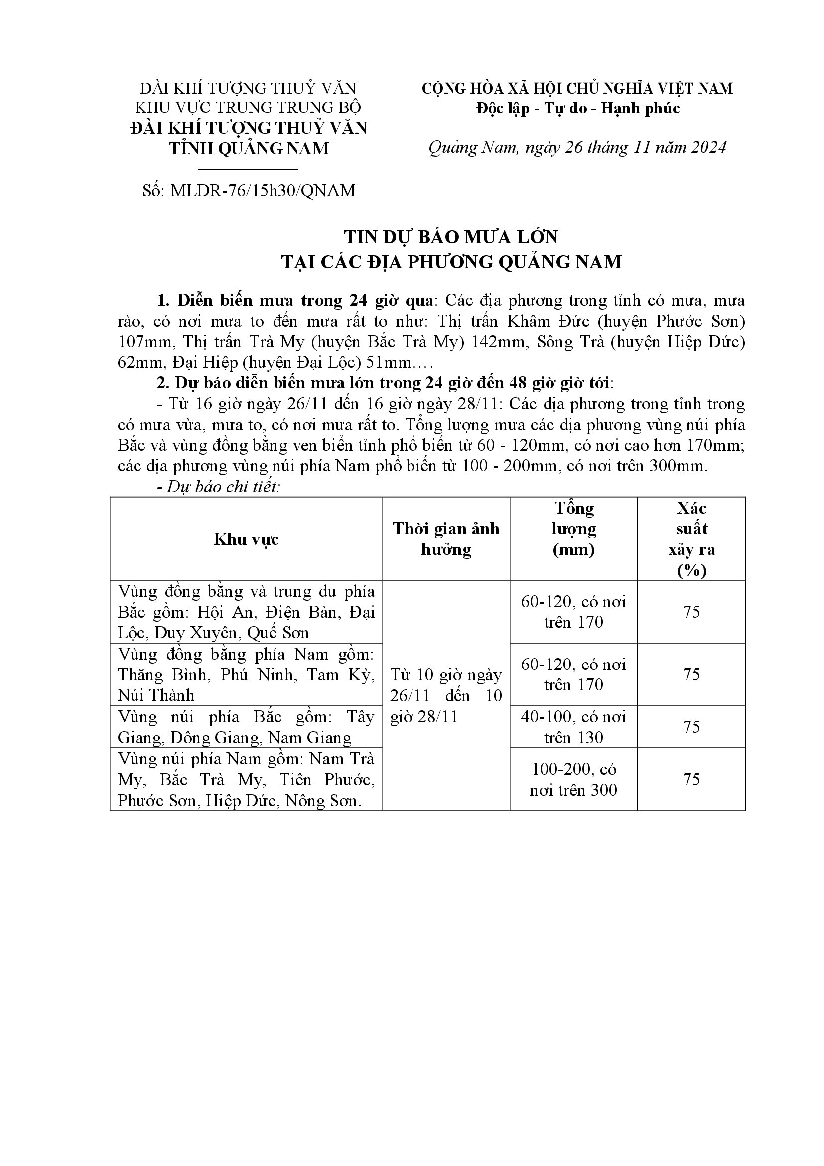Người đăng: Văn phòng thường trực Ban Chỉ huy Phòng chống thiên tai và TKCN Quảng Nam Ngày đăng: 16:08 | 26/11/2024 Lượt xem: 82