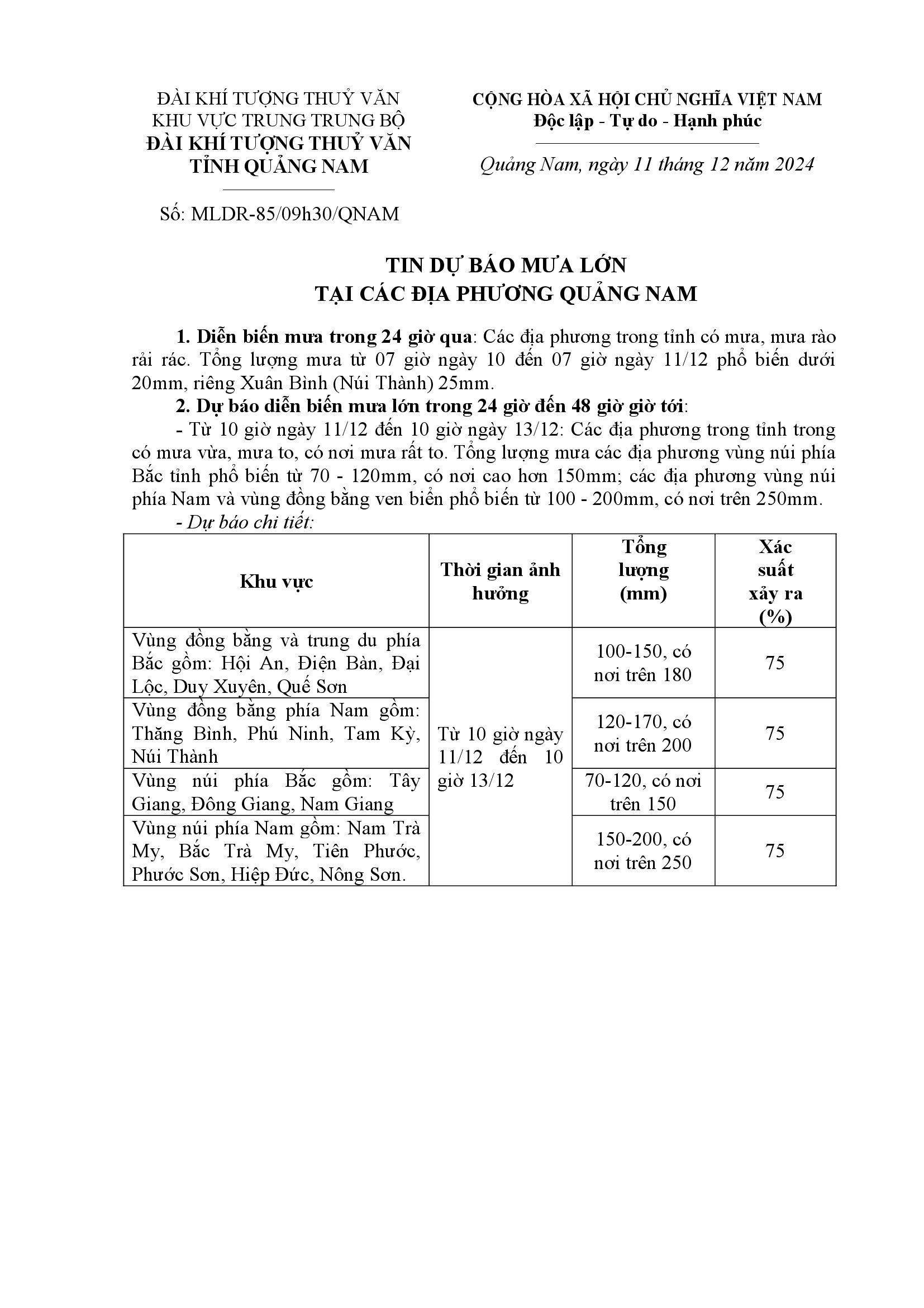 Người đăng: Văn phòng thường trực Ban Chỉ huy Phòng chống thiên tai và TKCN Quảng Nam Ngày đăng: 9:25 | 11/12/2024 Lượt xem: 102
