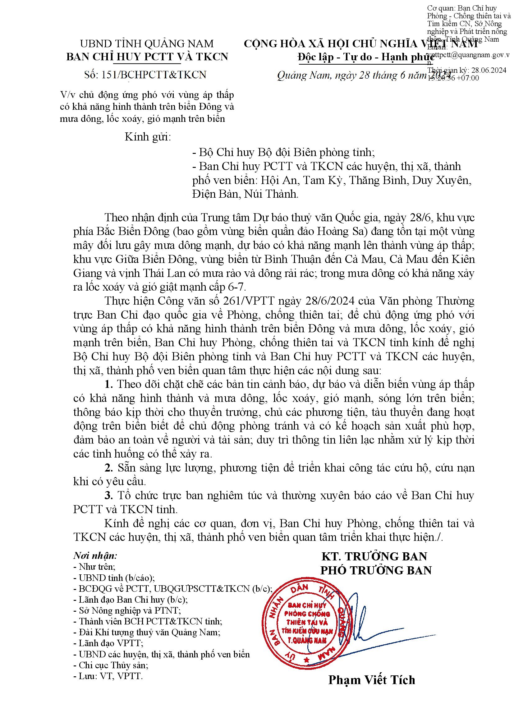 Người đăng: Văn phòng thường trực Ban Chỉ huy Phòng chống thiên tai và TKCN Quảng Nam Ngày đăng: 15:33 | 28/06/2024 Lượt xem: 214